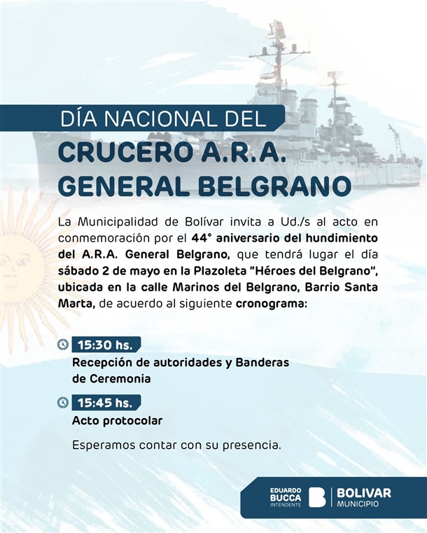 El mismo se llevará a cabo el sábado 2 de mayo en la Plazoleta “Héroes del Belgrano”, ubicada en calle Marinos del Belgrano, en el barrio Santa Marta. De acuerdo al cronograma estipulado a las 15.30h será la Recepción de autoridades, para dar inicio al acto protocolar a las 15:45h.