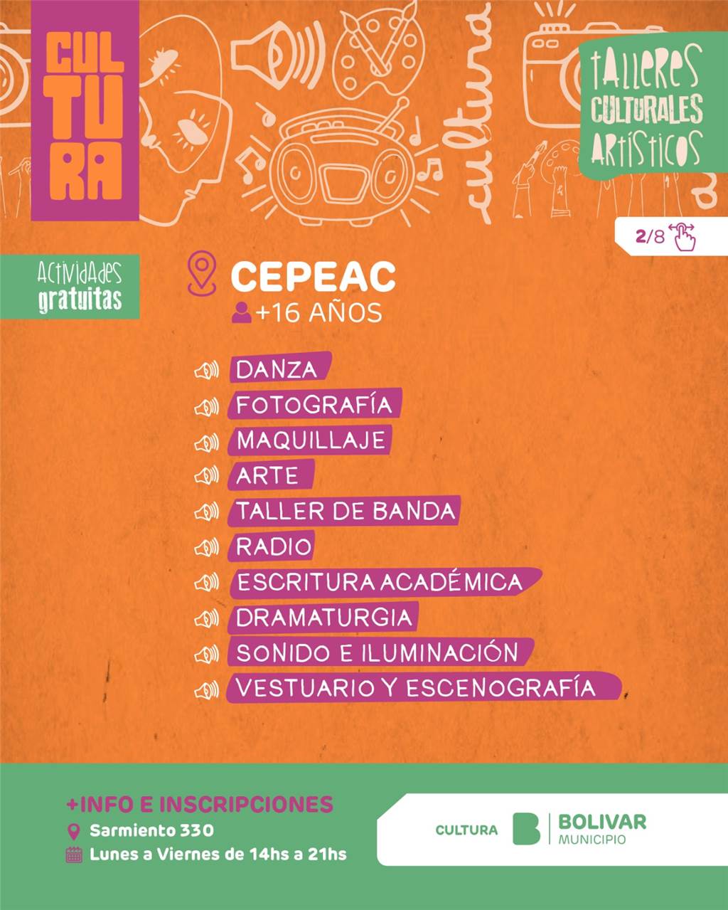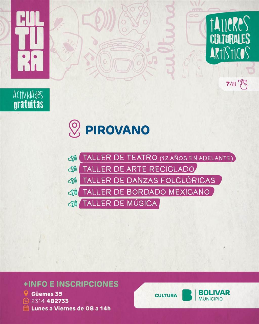 A través de esta amplia oferta, el Municipio continúa promoviendo el acceso a la cultura, fortaleciendo el desarrollo artístico local y generando espacios de participación en toda la comunidad, reafirmando año a año la importancia de sostener estos espacios como parte fundamental de la vida cultural de Bolívar.