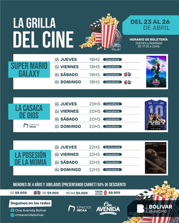 La boletería estará abierta de 17:30 a 22h, para que vecinos y vecinas puedan acercarse y disfrutar de una salida en la pantalla grande.