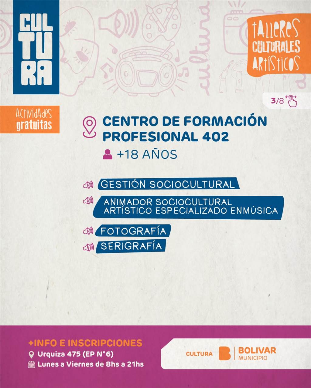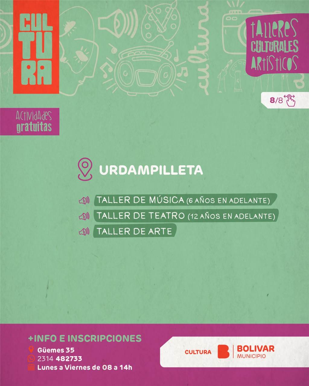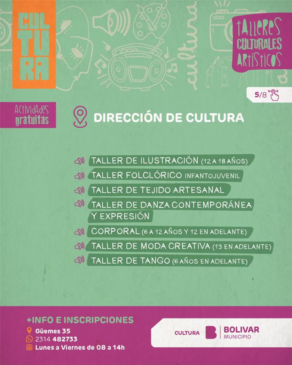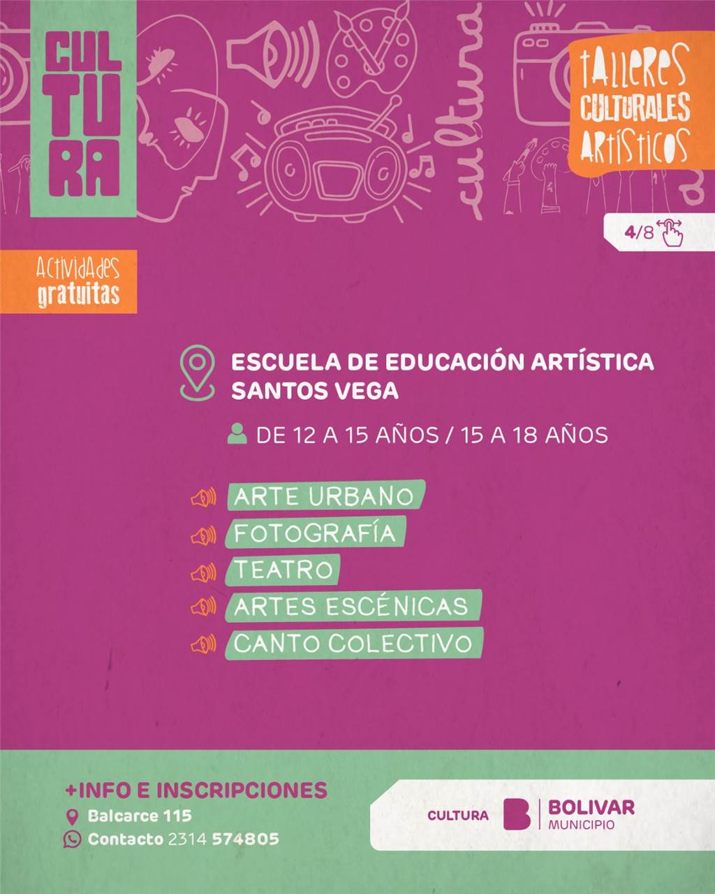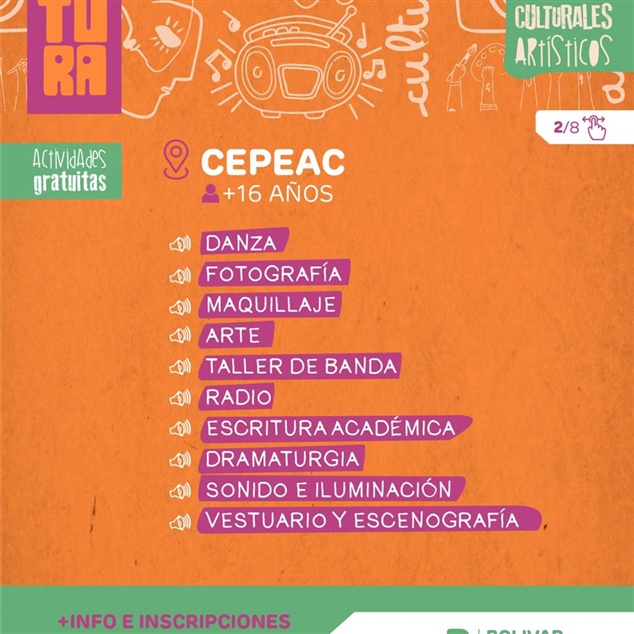 A través de esta amplia oferta, el Municipio continúa promoviendo el acceso a la cultura, fortaleciendo el desarrollo artístico local y generando espacios de participación en toda la comunidad, reafirmando año a año la importancia de sostener estos espacios como parte fundamental de la vida cultural de Bolívar.