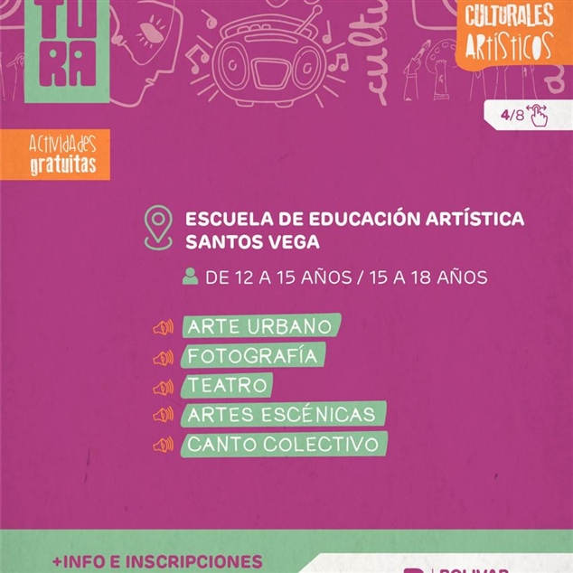 La Escuela de Educación Artística Santos Vega, ubicada en Balcarce 115, ofrece talleres para jóvenes de 12 a 18 años en arte urbano, fotografía, teatro, artes escénicas y canto colectivo. Para más información, los/as interesados/as pueden comunicarse al 2314-574805.