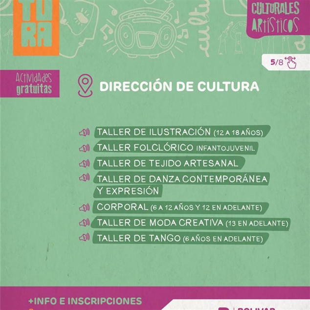 En la sede de la Dirección de Cultura, ubicada en Güemes 35, se impulsan múltiples talleres, entre ellos ilustración para jóvenes entre 12 a 18 años, folclore infantojuvenil, tejido artesanal, danza contemporánea y expresión corporal desde los 6 años, moda creativa desde los 13 años y tango desde los 6 años.