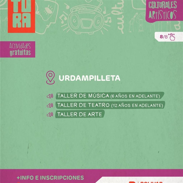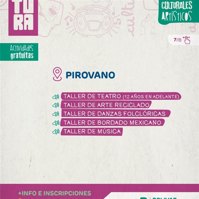 En las localidades, la propuesta también se fortalece: en Pirovano habrá talleres de teatro, arte reciclado, danzas folclóricas, bordado mexicano y música; mientras que en Urdampilleta se dictarán talleres de música, teatro y arte. En ambos casos, la inscripción se realiza en la Dirección de Cultura.