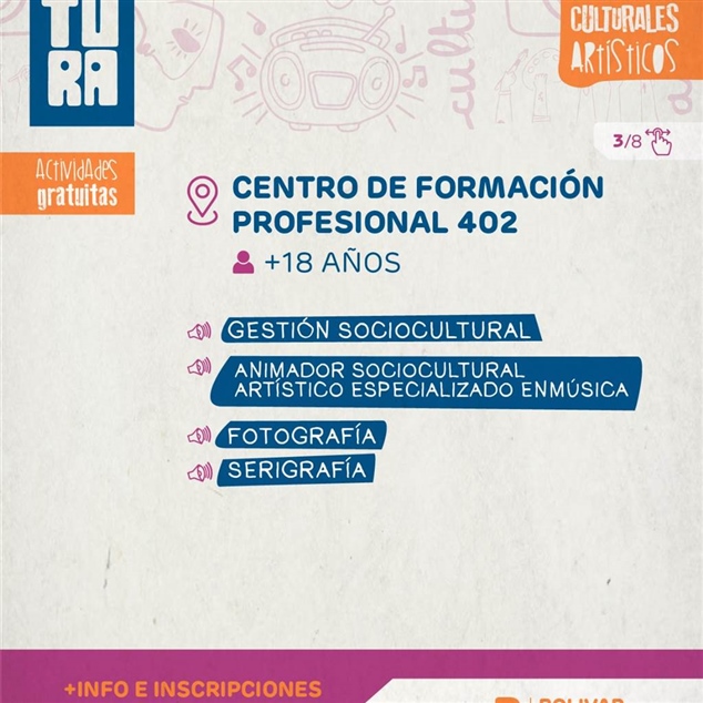En el Centro de Formación Profesional N° 402 se dictarán las propuestas de gestión sociocultural y animador sociocultural artístico con orientación en música, fotografía y serigrafía. Las inscripciones están abiertas de lunes a viernes de 8 a 21h, en Urquiza 475 – EP N°6, y están dirigidas a personas mayores de 18 años.