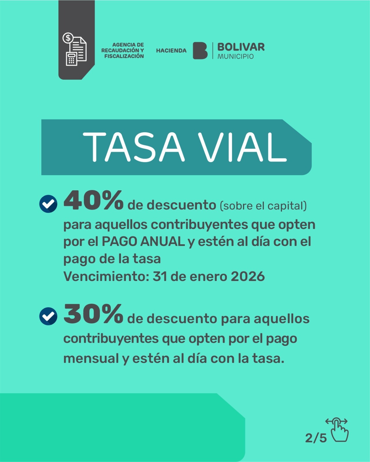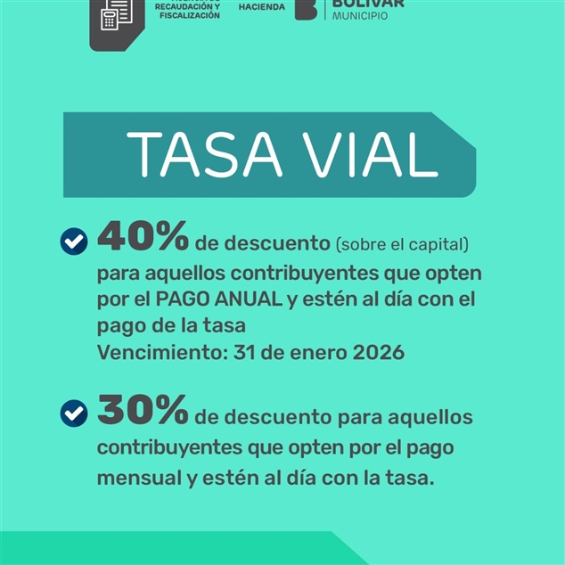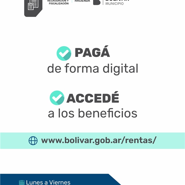El Municipio de Bolívar, a través de la Secretaria de Hacienda y la Agencia de Recaudación y Fiscalización, informa los descuentos vigentes en tasas municipales con el objetivo de fomentar el uso de medios de pago digitales, en línea con una política de modernización del Estado y reducción del uso de papel.