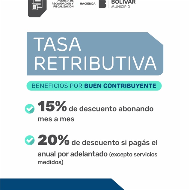 En el caso de la Tasa Retributiva, los vecinos pueden acceder a un 15% de descuento por buen contribuyente, y a un 20% de descuento si optan por el pago anual adelantado, exceptuando a los servicios medidos.