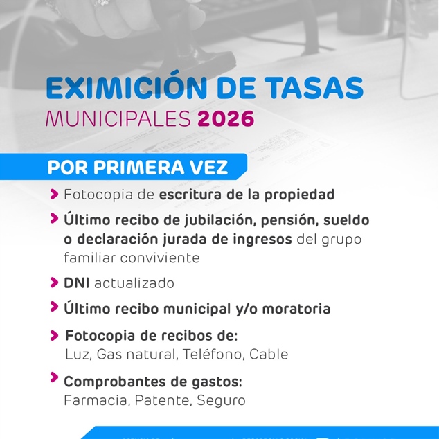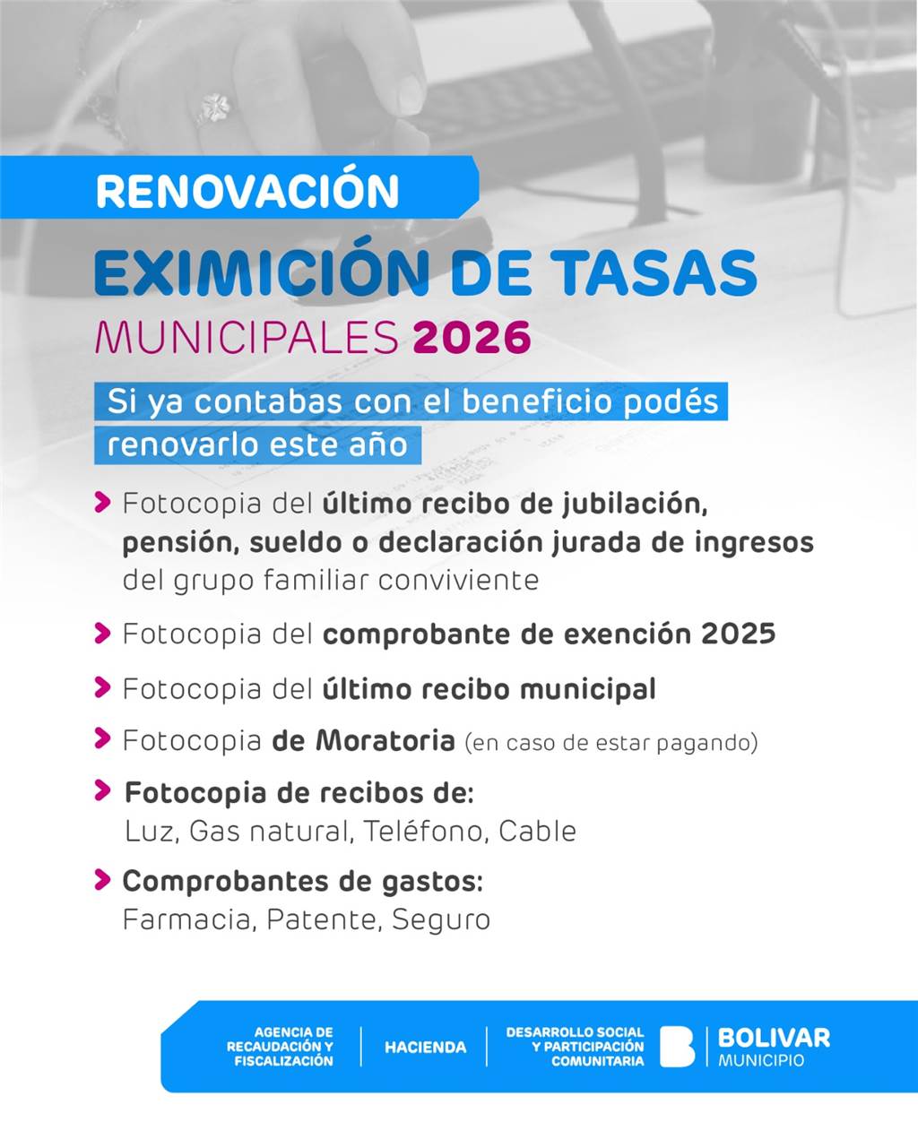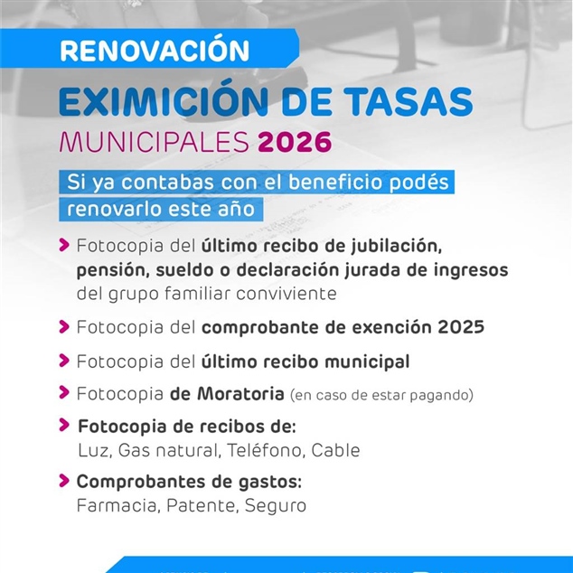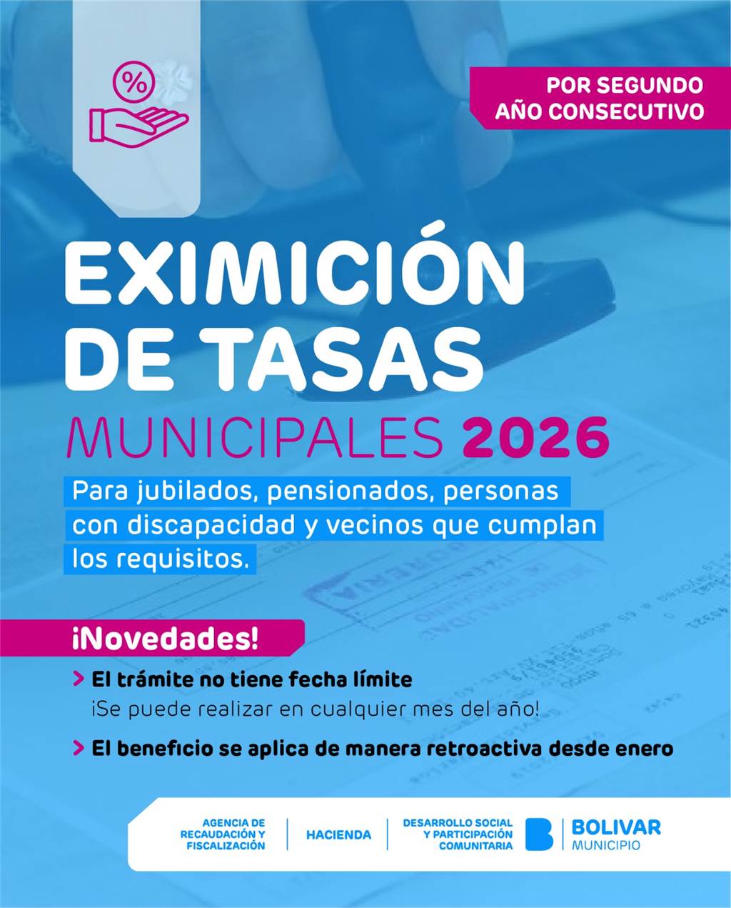 En este marco, también se informa que ya se encuentra habilitado el trámite de Eximición de Tasas Municipales 2026, destinado a jubilados, pensionados, personas con discapacidad y vecinos que cumplan con los requisitos establecidos. Esta acción se lleva adelante de manera conjunta entre la Agencia de Recaudación y Fiscalización y la Dirección de Desarrollo Social.
