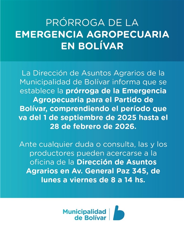 La Dirección de Asuntos Agrarios de la Municipalidad de Bolívar informa que el pasado viernes 19 de septiembre se firmó el decreto que establece la prórroga de la Emergencia Agropecuaria para el Partido de Bolívar, comprendiendo el período que va del 1 de septiembre de 2025 hasta el 28 de febrero de 2026.