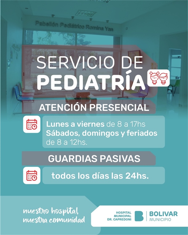 El Servicio de Pediatría del Hospital Municipal Capredoni cuenta con un hall exclusivo para pacientes pediátricos y funciona con atención presencial de lunes a viernes hasta las 17 h en el Pabellón Romina Yan. Los días sábados, domingos y feriados, el servicio dispone de atención pediátrica hasta el mediodía.
