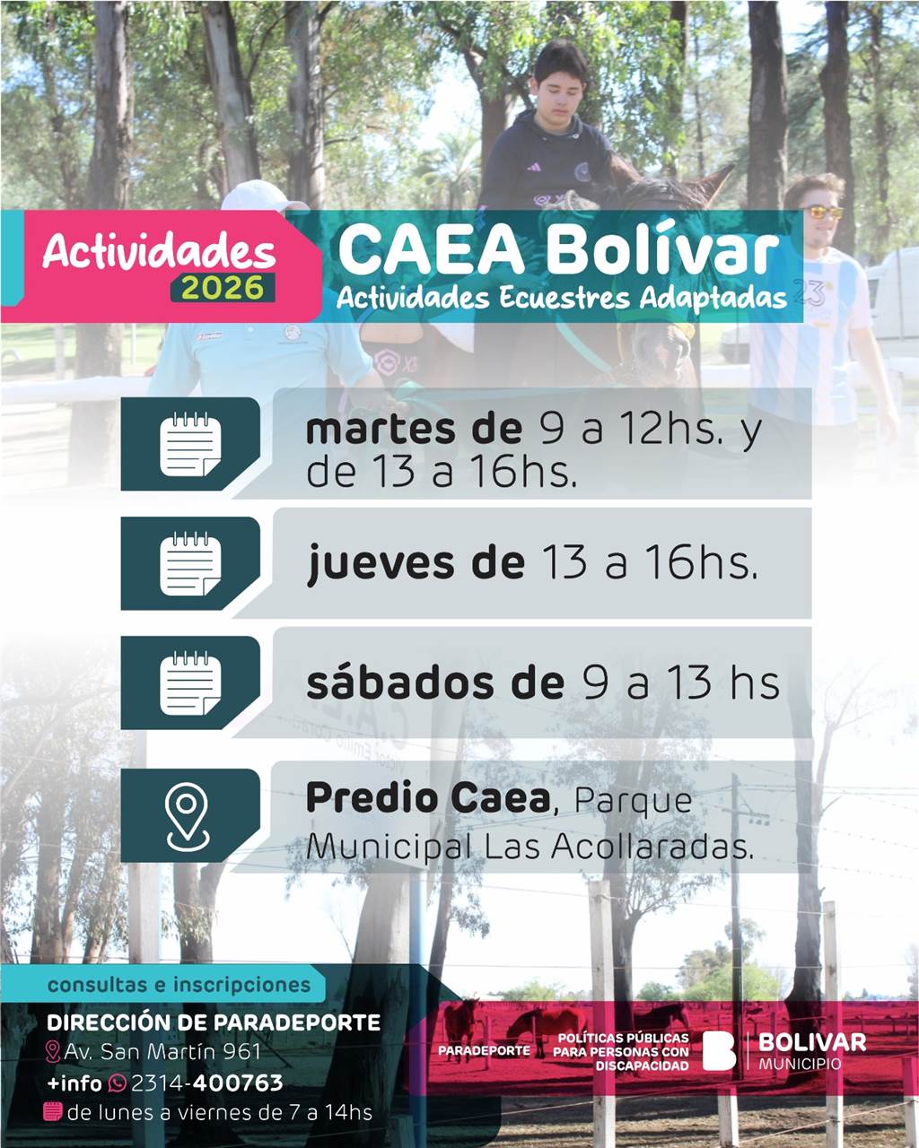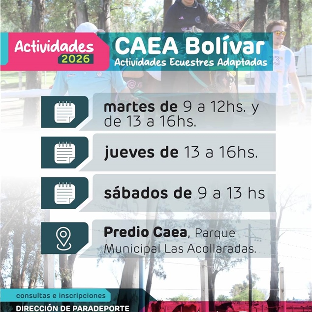 Comenzaron también las actividades en el CAEA “Carlos Emilio Coradini”, donde se ofrecen espacios de trabajo con caballos, favoreciendo el desarrollo físico, emocional y social. Las jornadas se realizan los martes de 9 a 12 y de 13 a 16h, jueves de 13 a 16h y sábados de 9 a 13h en el predio CAEA, ubicado en el Parque Municipal Las Acollaradas.