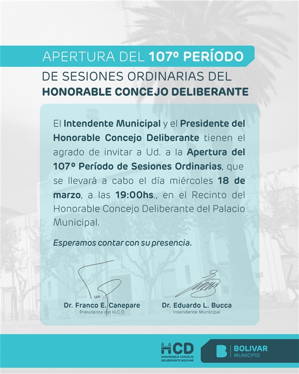 Desde el Honorable Concejo Deliberante y el Departamento Ejecutivo se invita a instituciones, organizaciones y vecinos y vecinas del distrito a acompañar este momento institucional que marca el inicio del nuevo período de sesiones ordinarias del órgano legislativo local.