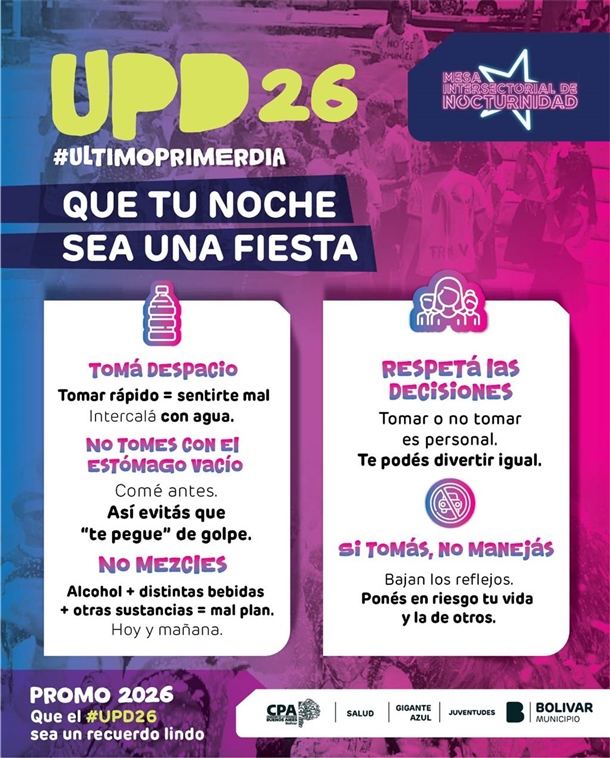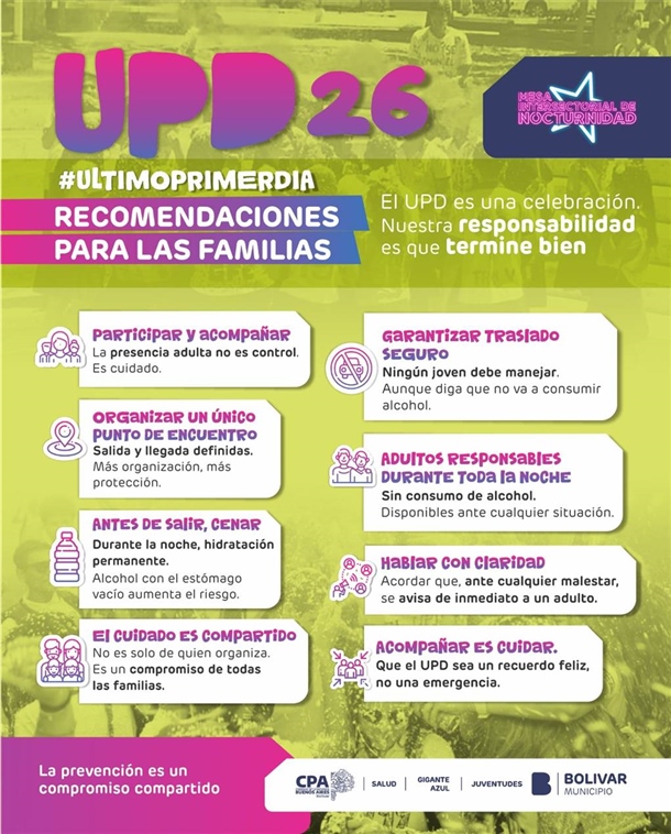 El UPD se ha convertido en una tradición para quienes comienzan su último año de secundaria. En ese contexto, desde las áreas municipales se trabaja de manera articulada para acompañar a los estudiantes y sus familias, brindando información y recomendaciones que permitan disfrutar del encuentro de forma cuidada.