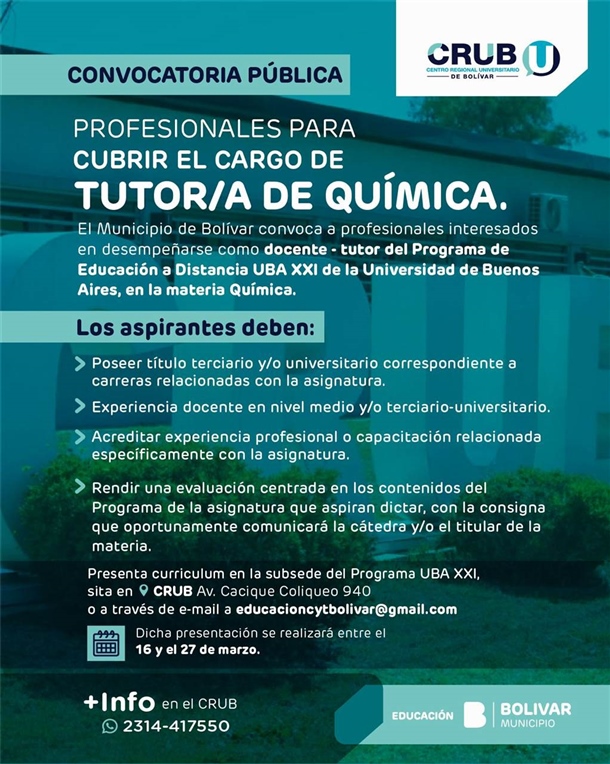 Las personas interesadas podrán presentar su currículum vitae en la subsede del Programa UBA XXI, ubicada en el CRUB (Av. Cacique Coliqueo 940), o enviarlo por correo electrónico a educacioncytbolivar@gmail.com. La recepción de postulaciones se realizará entre el 16 y el 27 de marzo.
