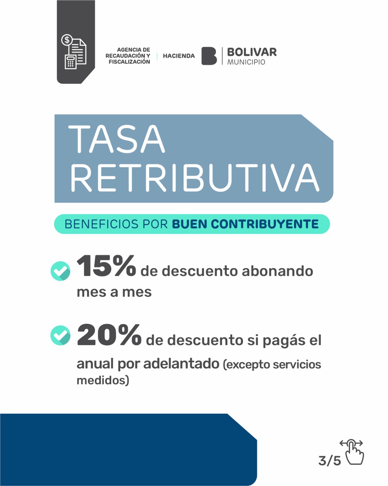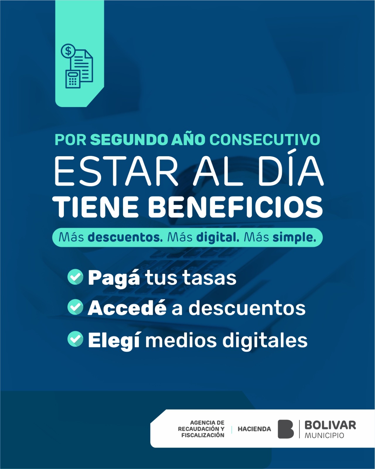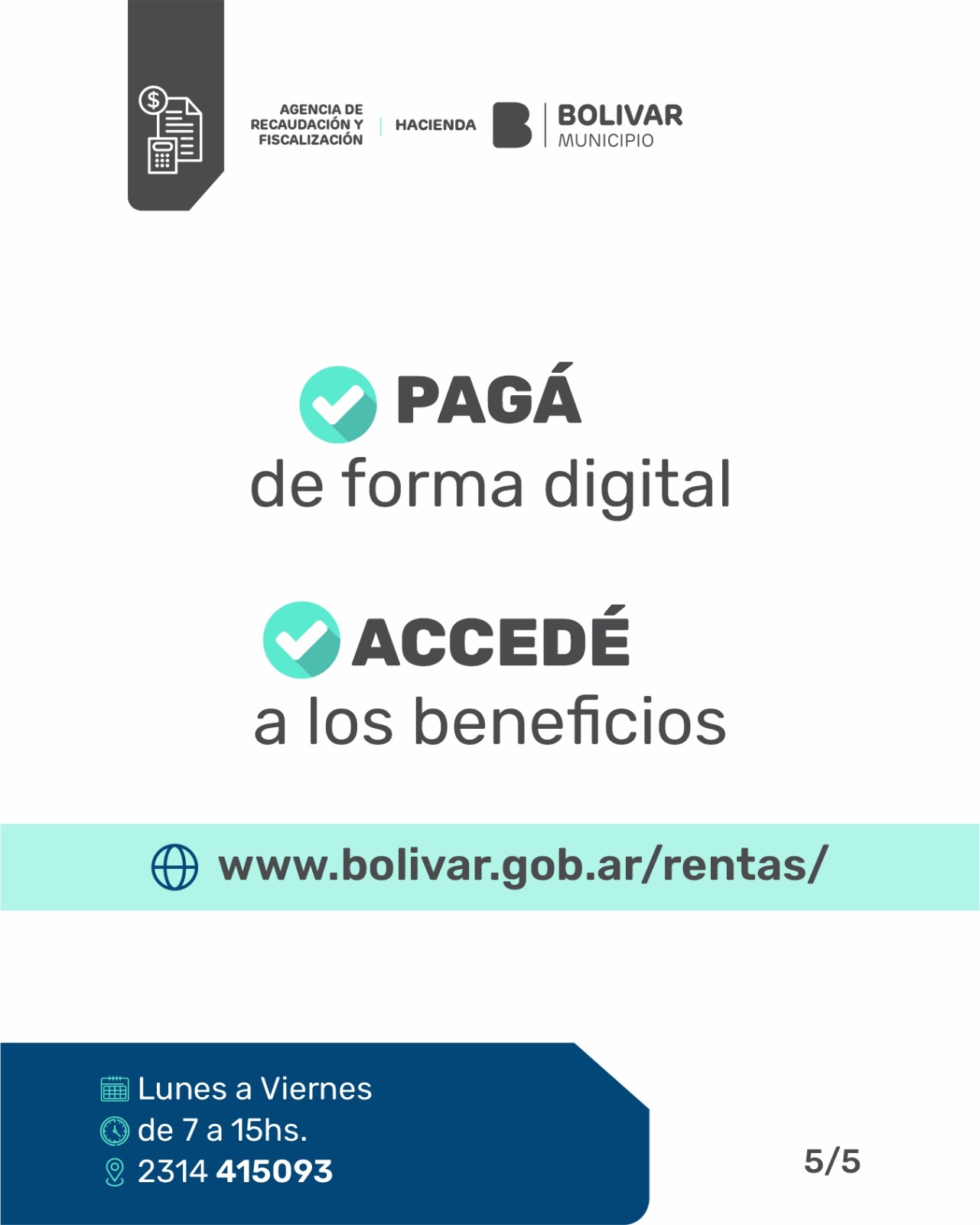 El Municipio de Bolívar, a través de la Secretaria de Hacienda y la Agencia de Recaudación y Fiscalización, informa los descuentos vigentes en tasas municipales con el objetivo de fomentar el uso de medios de pago digitales, en línea con una política de modernización del Estado y reducción del uso de papel.