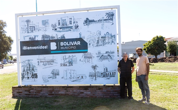 Como parte de esta propuesta, se renovó el cartel de ingreso a Bolívar, sobre la Ruta 226, donde ya puede apreciarse esta intervención. En ese espacio, el director de Turismo Emilio Leonetti estuvo junto al arquitecto, destacando el trabajo conjunto y el valor de incorporar producciones locales a la imagen urbana.